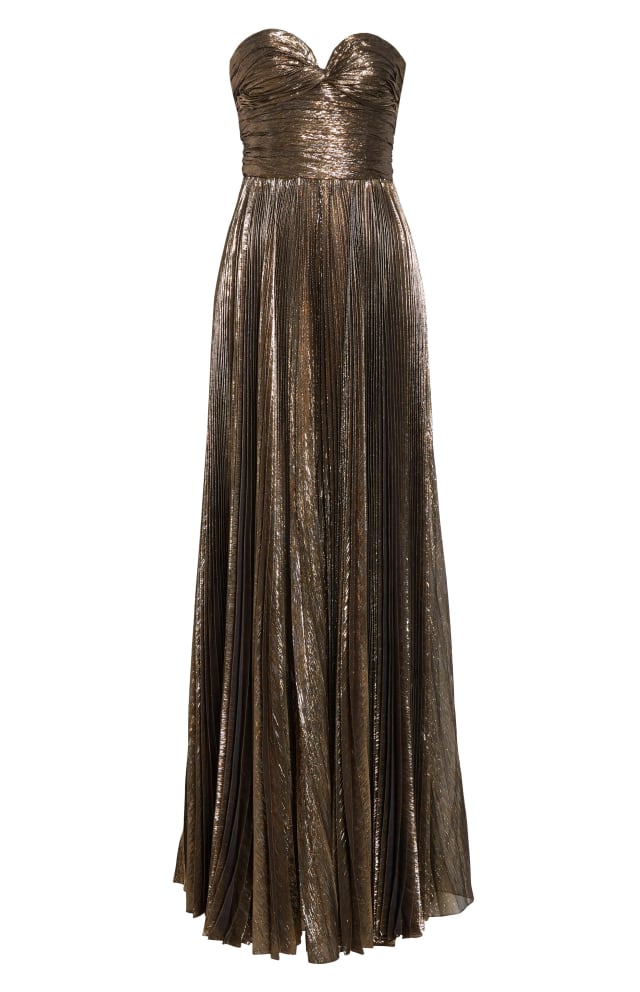Gathers and plissé pleating multiply the shimmer radiating from this strapless gown styled with a twist-detail sweetheart neck from a perfect-drape silk blend.